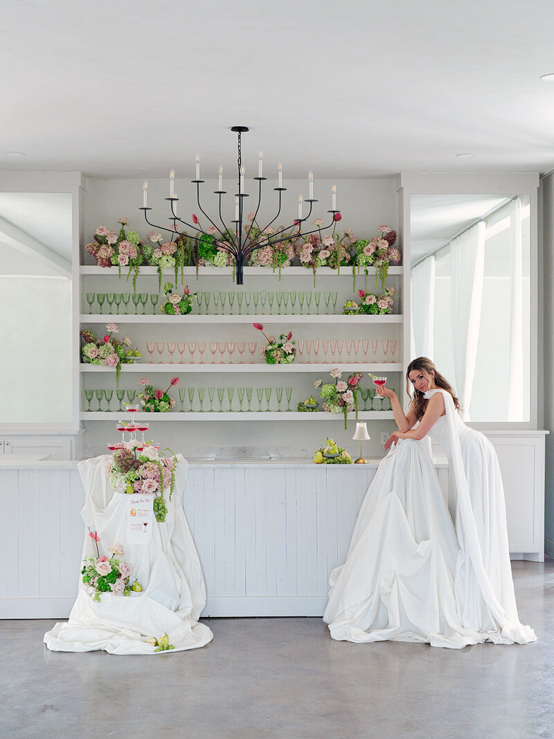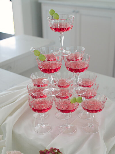 The bar became a visual centerpiece with its cascading florals, pastel glassware, and a pink champagne tower that shimmered under soft light. Each coupe was garnished with a single pearl-tipped grape—a modern signature that tied the entire design together. It was playful, polished, and completely transportive—the kind of visual story that celebrates romance in its most artful form.