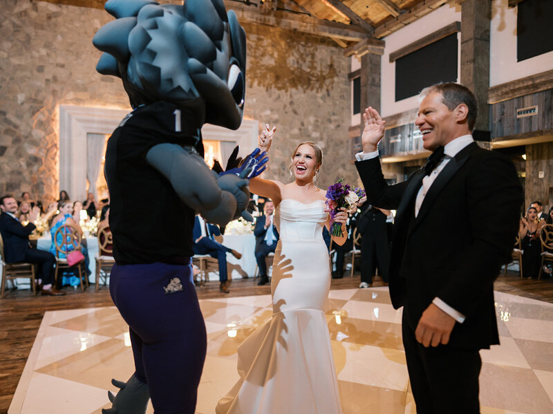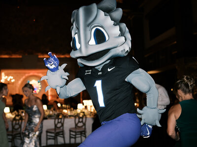 Just when the night felt like it couldn’t get any sweeter, a surprise guest made his entrance. TCU’s very own SuperFrog. As lifelong Horned Frogs, having him join the celebration was a moment of pure joy for Taylor and Tucker. From high-fives on the dance floor to the biggest smiles of the evening, SuperFrog’s visit brought a burst of school spirit, nostalgia, and the kind of magic only game-day traditions can spark.